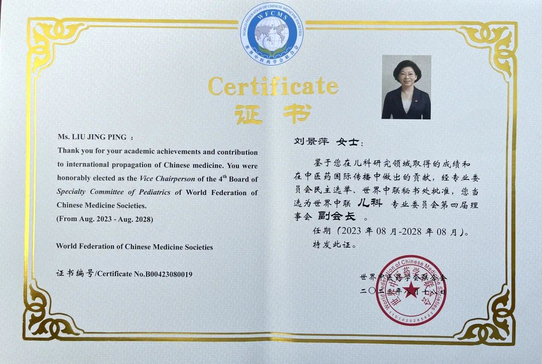 AG庄闲药业集团党委书记、董事长刘景萍当选世界中医药学会联合会儿科专业委员会第四届理事会副会长